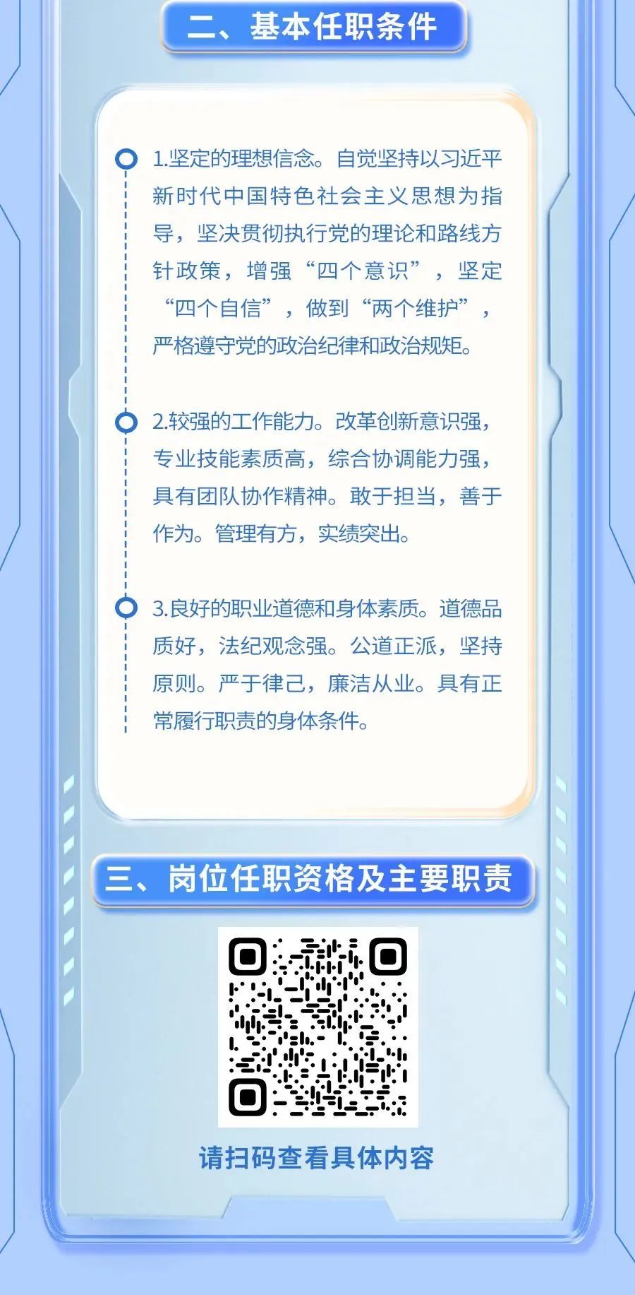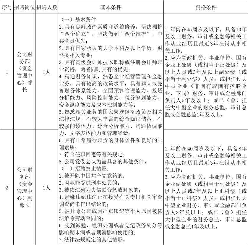 1.硕士研究生及以上学历,审计、财务、会计、金融等相关专业。2.年龄40周岁(含)以下,相关工作经验5年以上。(年龄、工作经验计算截止日期为2023年8月31日)3.具备大型国有企业、金融机构、会计师事务所等工作经验,熟悉国资监管、证券行业监管要求者优先。