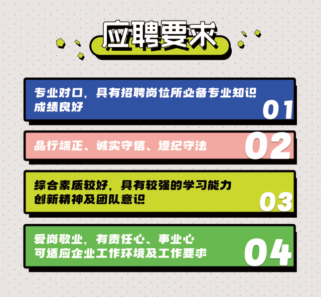 1.2024年普通高等教育应届毕业生,研究生及以上学历、硕士及以上学位,2024年7月31日前取得毕业证、学位证。2.拥护中国共产党领导,政治立场坚定。思想品德良好,遵守国家法律法规和学校规章制度,遵守社会公德,认同山东健康集团企业文化。3.在校期间学习成绩优异,具有大型企业实习经历,具备学校社团工作经历。具有良好的适应能力、学习创新能力、独立工作能力和团队协作能力。学生干部、学生党员、在校期间获得奖学金等荣誉者优先考虑。4.身心健康。无违法犯罪和违反校纪校规等不良记录。