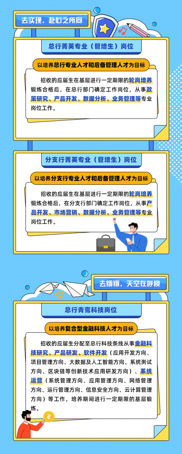 1.软件开发岗。主要从事银行信息系统研发、需求分析、软件开发和应用支持等工作。