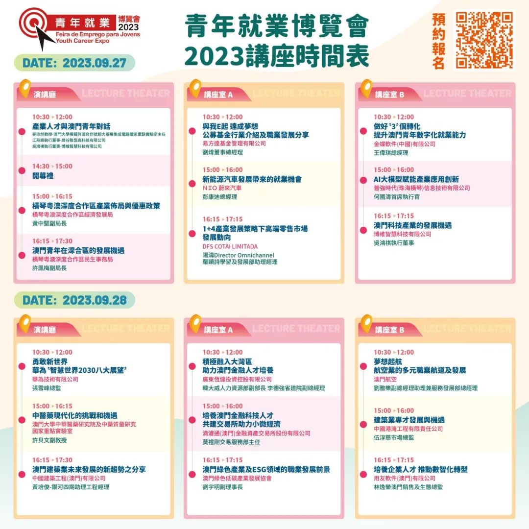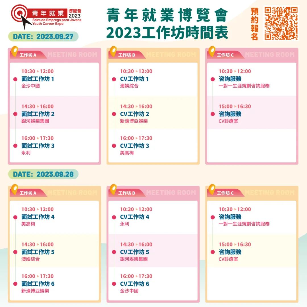 講座及工作坊由9月19至24日接受網上報名,有興趣者可登入以下連結https://www.dsal.gov.mo/zh_tw/standard/youthcareerexpo2023.html 了解詳情及報名參加,成功報名人士會收到短訊確認,憑短訊簽到進場參加講座,名額有限,額滿即止。