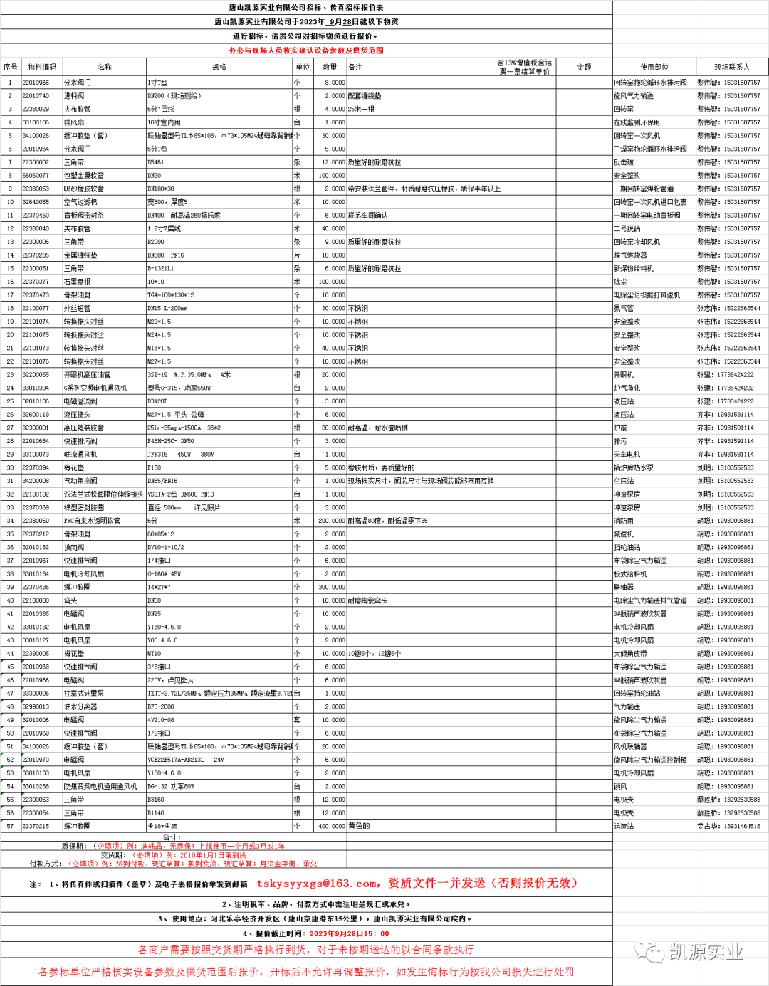 点击上方蓝色文字一键关注我们!公司拟对五金液压件实行招标采购,请于2023年9月28日15:00之前将投标文件发至tskysyyxgs@163.com(加盖公章有效),报价要求:要注明所能供应质保期、供货期、付款方式及联系方式,提供公司资质。我公司根据各供应商报价由低到高综合选择。该邮箱为我公司接受传真招标报价的唯一邮箱,如发现有供货商将报价单私自发送至其他个人邮箱或微信中,此报价单作废,连续发现两次将考虑不再与该供货商合作。