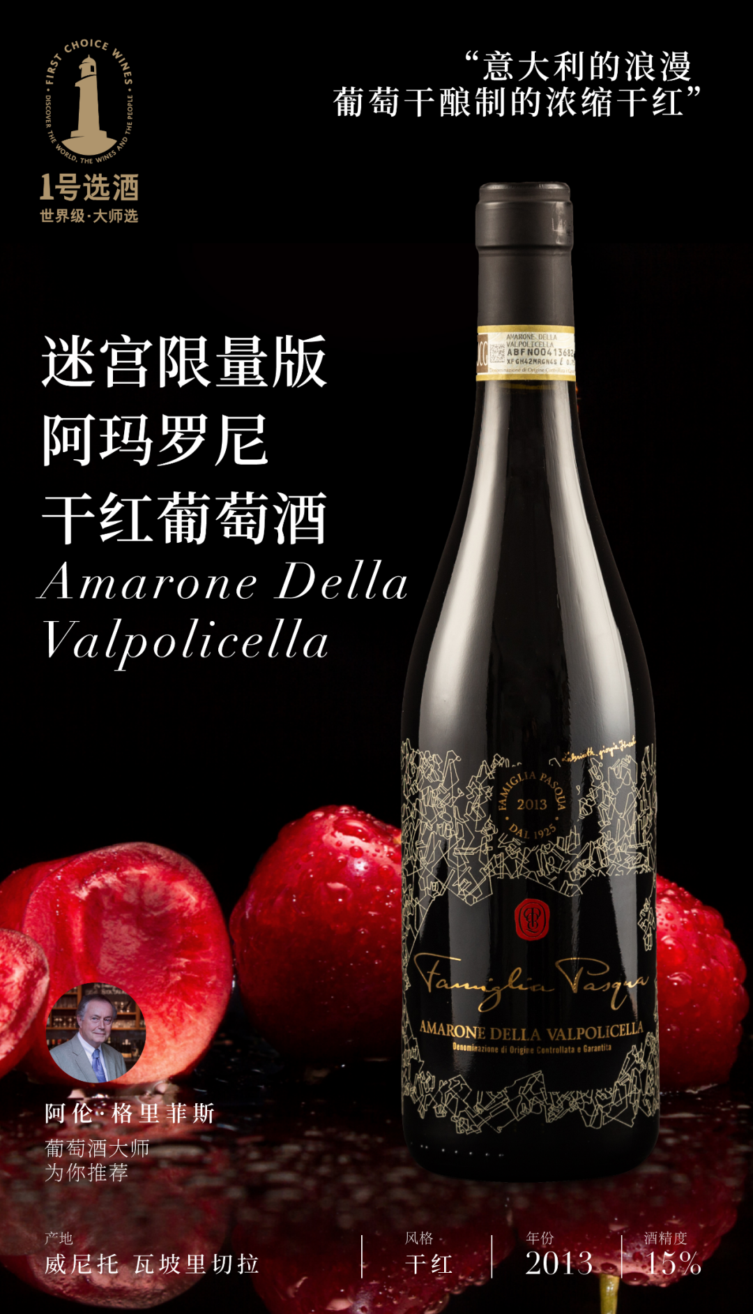 “伴随着些许糖渍樱桃的气息,扑来有力量的薄荷般清凉。丝绸触感拂过舌尖,甘草娓娓道来。精雕细琢般华丽口感,果酸与单宁和谐共处。韵味无穷,实属阿玛罗尼中的典范!”
