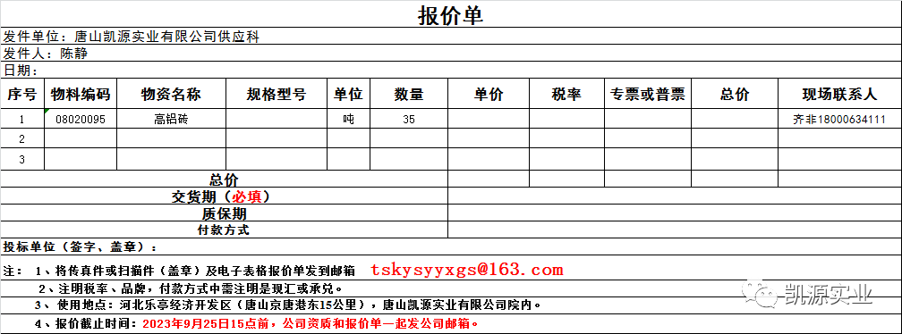 公司拟对高铝砖实行招标采购,请于2023年9月25日下午15点之前将投标文件发至tskysyyxgs@163.com(加盖公章有效),报价要求:要注明所能供应质保期、供货期、付款方式及联系方式,提供公司资质。我公司根据各供应商报价由低到高综合选择。该邮箱为我公司接受传真招标报价的唯一邮箱,如发现有供货商将报价单私自发送至其他个人邮箱或微信中,此报价单作废,连续发现两次将考虑不再与该供货商合作。