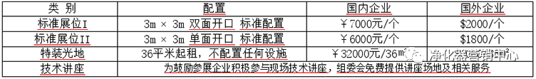 说明: 1、国际标准展位的配置:三面白色展板(高度2.5米)、中文楣板、2盏射灯、1张咨询桌、2张折椅、1个纸屑篓及1只电源插座(220V/5A)。另外标准展转角展位均加收10%的费用; 2、展位费指展商租用标准展位或光地的费用,不包含展品的运输仓储、吊装就位、展具租赁、现场水电气租用、特别装修搭建及其管理费等费用; 3、为鼓励参展企业展会现场技术讲座,组委会免费提供讲座场地、照明、音响、桌椅、饮水、投影仪等,但不包括会场布置或其他特别费用。