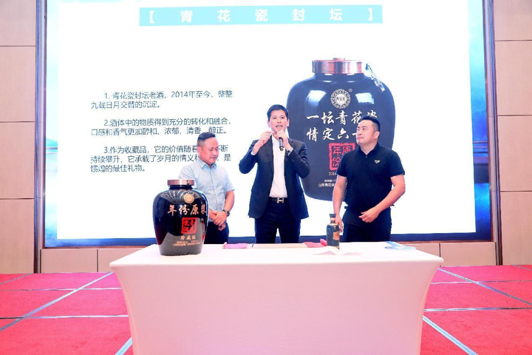 主持人现场介绍了青花瓷封坛酒,重点强调秘造封坛之风格突出,酒体醇正,其经过勾调成为成品酒之后,在酒厂存放了8年以上,过程中摒弃了新酒的刺激感,保留了酒体的风味、口感与香气,空杯留香,品质得以保障,是收藏、馈赠、宴饮之佳品。