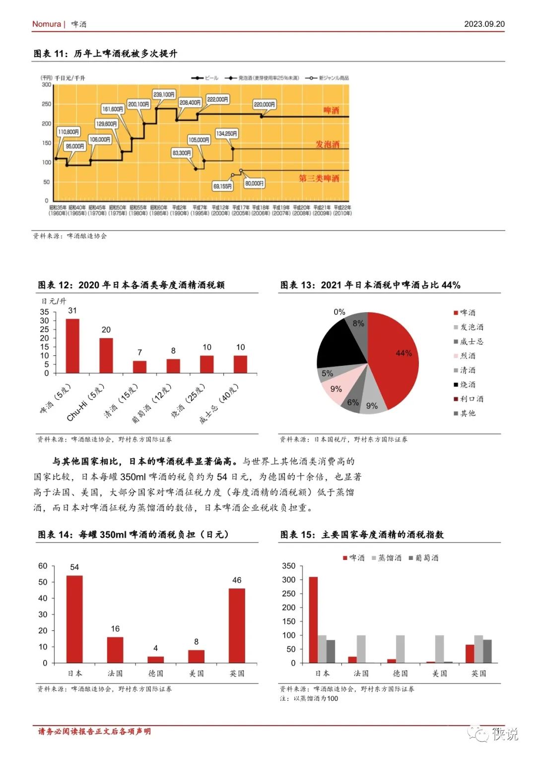 单价方面,日本啤酒 CPI 与整体 CPI 基本同步变化,近年啤酒均价同比稳中略升,我们判断主要系日本差异化税收政策分下售价更低的发泡酒、第三类啤酒占比提升拉低均价,但高端啤酒份额仍在食品提升。