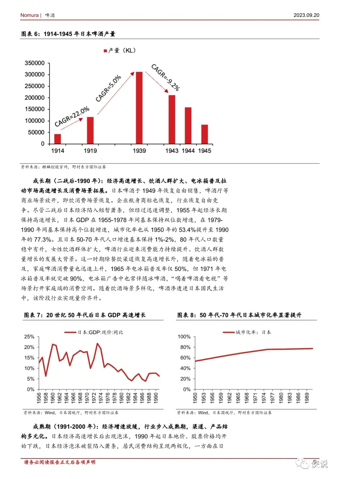 渠道制胜: 把握变化先机,成就时代强者。20 世纪 50 年代日本啤酒市场家庭消费端高速发展,麒麟把握住家庭渠道扩容的机遇,70 年代市占率达到60%以上。80 年代日本啤酒消费方式从宅配到家向到店购买转变,朝日发力渠道,推出的罐装 SuperDry 适配渠道转变,最终实现市场份额逆转。我们认为抢占渠道变化先机的公司能充分享受渠道扩容红利,成为时代的强者。单品为王:大爆品的打造具有颠覆效果。