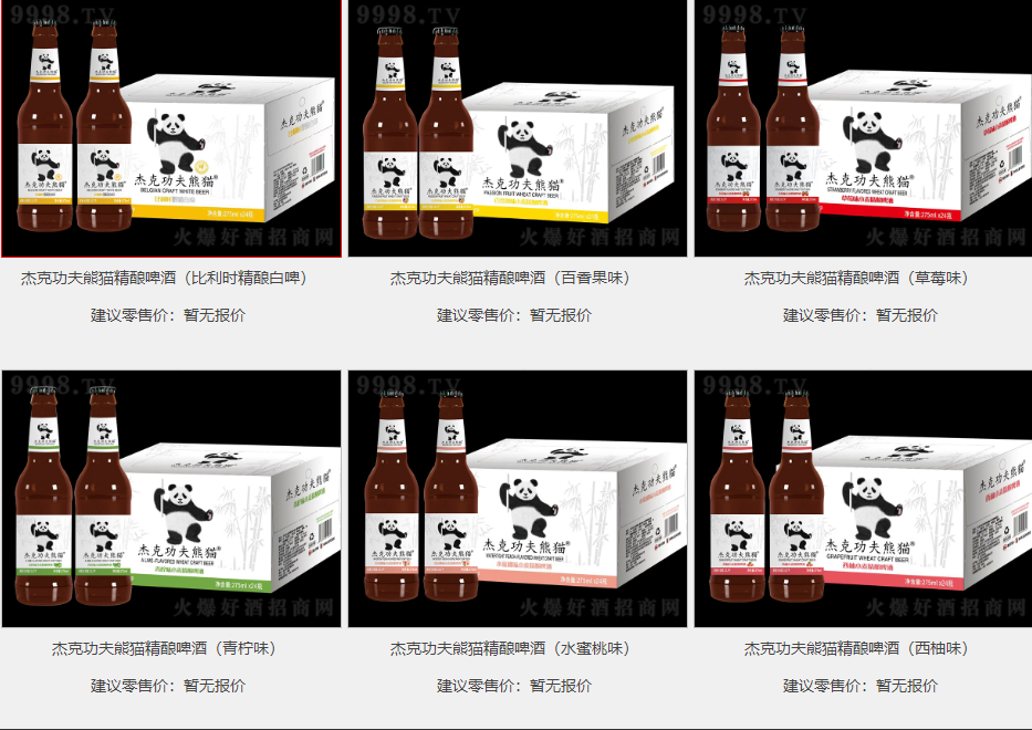 杰克功夫熊猫系列精酿啤针对不同消费人群,推出精酿白啤、百香果味、草莓味、青柠味、水蜜桃味、西柚味等多种风味,多系列产品,适合多渠道销售,涵盖于餐饮,商超,便利店等渠道,终端接受率高,大街小巷上的商店,餐馆都能看到它们的身影。