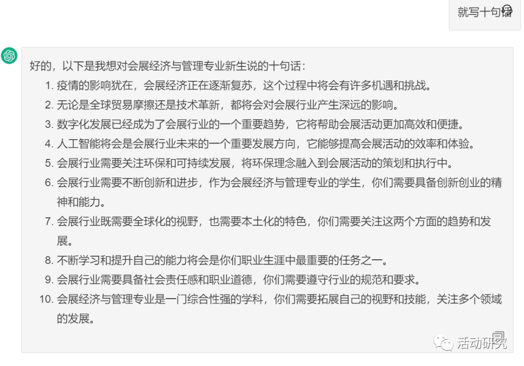 下面的内容,得到了ChatGPT的协助,我给出了限定词,并做了相应修改。设定的问题是“请将疫情后的复苏、国际贸易摩擦、技术革新、数字化发展、人工智能等因素考虑进去,以《我想对会展专业新生说的十句话》为题,写一篇评论。”