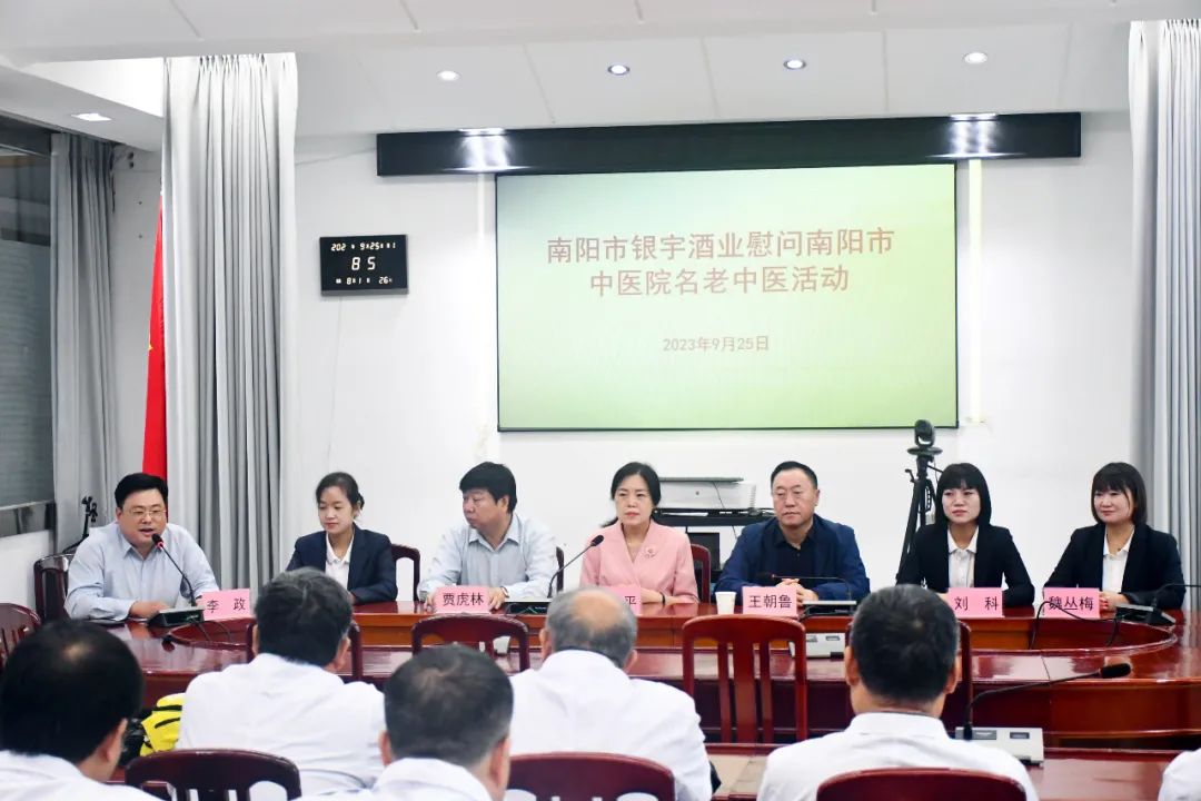 南阳市中医院院长王朝鲁一行热情接待了南阳市银宇酒业有限公司董事长周玉平一行并组织召开座谈。王院长首先对此次银宇酒业到中医院开展慰问活动的爱心之举表达了感谢,并表示将不断提升医院的医疗技术水平和服务水平,切实提升群众满意度,为广大群众的身体健康保驾护航,不辜负爱心企业以及社会各界对中医院的关心和支持。周总则表示,健康是人类永恒的追求,也是美好生活的应有之义,此次借中秋、国庆双节来临之际,看望中医院名老中医专家们,旨在表达对中医药文化的景仰和对名老中医们的一份敬意。