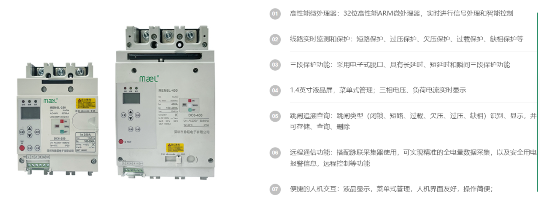 mael脉联电子自主研发的智能塑壳、智能断路器产品,具有多重检测功能和故障预警、报警功能,能够实时监测线路中电流、电压、功率、频率、温度、用电量等参数。对过压、欠压、过载等发送预警,并实行越限自动断电保护,保障用电安全。