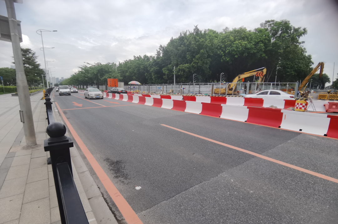 在阅江路雨水箱涵施工过程中,由于施工地点位于广州市一江两岸重要景观带,临近会展中心,占用海珠区的主干道及景观大道部分道路施工,为降低道路围蔽带来的影响,项目部管理人员坚持安全第一、以人为本的原则,以满足施工需要为前提,与交警部门多次沟通协商、优化占道方案,最终敲定了由原设计双向6车道调整为双向4车道的交通疏解方案,最大程度减少对交通道路的占用以及景观带部分绿化树木的迁移。采用了防撞纠偏钢护栏,并纳入交警部门航拍监管系统试点项目,依靠科学手段管理,有效保障了周边行人、车辆的通行安全。