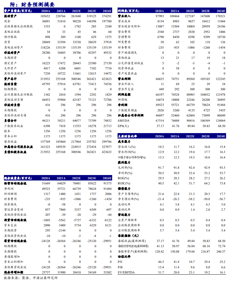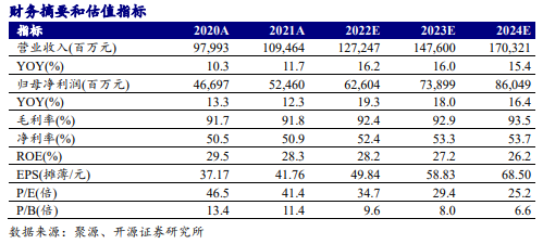 公司2022年预计实现营业总收入1272亿元左右,同比+16.2%左右,归母净利润626亿元左右,同比+19.3%左右。Q4预计实现营业收入375亿元,同比+15.6%,归母净利润182亿元,同比+19.8%。全年收入利润符合乐观预期,我们上调2022-2024年盈利预测,预计2022-2024年净利润分别为626.0(+5.5)亿元、739.0(+3.3)亿元、860.5(+0.1)亿元,同比分别+19.3%、+18.0%、+16.4%,EPS分别为49.84(+0.44)元、58.83(+0.27)元、68.50(+0.01)元,当前股价对应PE分别为34.7、29.4、25.2倍,公司可持续维持“买入”评级。