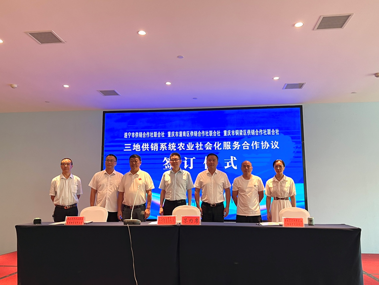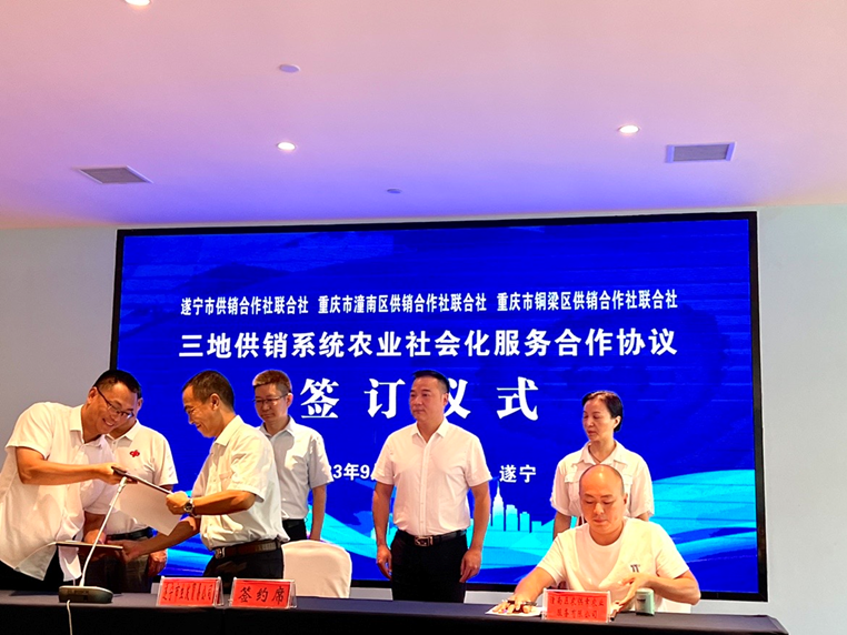 9月15日,四川省遂宁市供销合作社联合社、重庆市潼南区供销合作社联合社、重庆市铜梁区供销合作社联合社在四川遂宁召开三地供销系统农业社会化服务合作协议签订仪式,农服铜梁公司作为铜梁区社有企业代表参加签约。