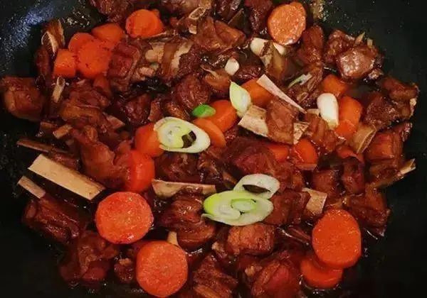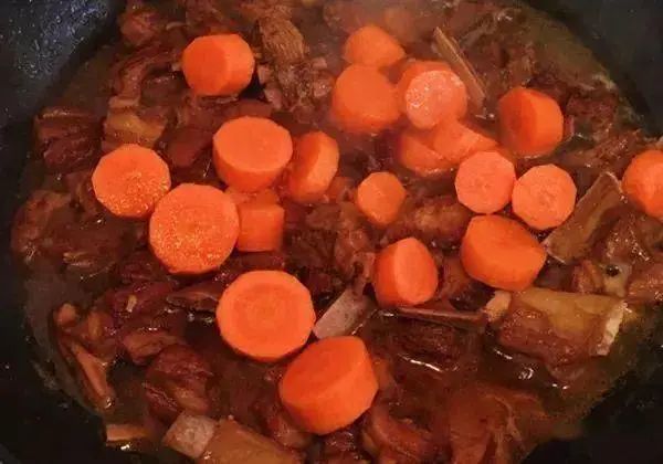 7.将胡萝卜放到快煮好的羊排里,翻炒几下,加盐调味,再焖煮二十分钟。