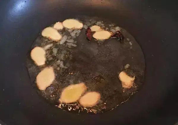 3.起油锅,锅子烧热后放入食用油,然后放入姜片,八角,冰糖炒一个糖色。冰糖融化成焦红色时就可以了。