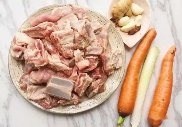 羊排2斤、胡萝卜2根、啤酒1瓶、八角2个、冰糖30克、生抽10克、老抽5克、盐0.5克、鸡精2克、葱姜适量、食用油20克、京葱一小段 、蒜头4个