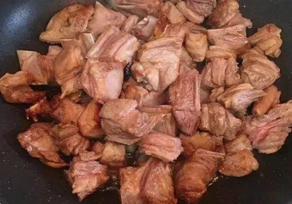 4.开中火,放入羊排翻炒,让羊排均匀的裹上糖色,煎至两面微黄。