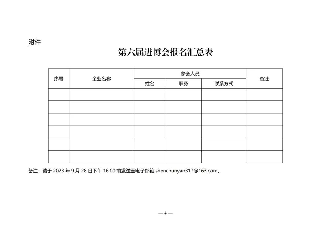 第六届中国国际进口博览会将在上海举办,有意向参与的企业可于今、明两天将报名汇总表发给成晟创业谷服务中心统一申报,并于9月28日前在官网、小程序或APP上完成报名。下附完整文件通知及专业观众系统说明。