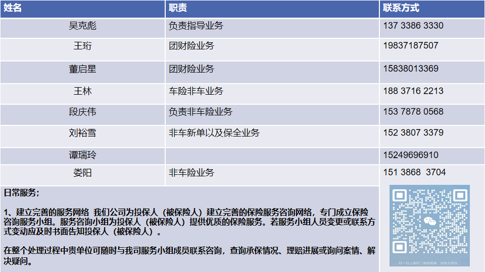 我们公司为投保人(被保险人)建立完善的保险服务咨询网络,专门成立保险咨询服务小组。服务咨询小组为投保人(被保险人)提供优质的保险服务。若服务小组人员变更或联系方式变动应及时书面告知投保人(被保险人)。