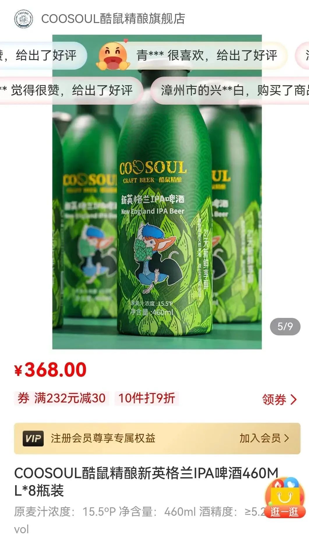 登录“酷鼠精酿”小程序,发现酷鼠精酿啤酒的价格的确比较“豪”。一款名叫“新英格兰IPA啤酒”,八支装的售价为368元,折算起来,单支售价在46元之上。