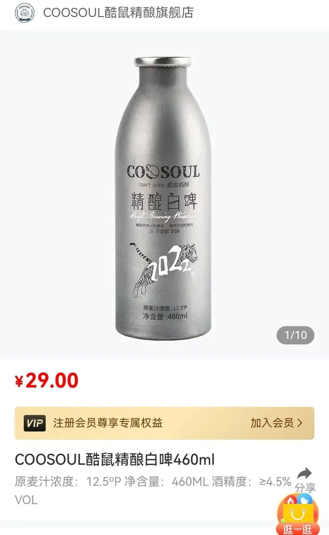 另外一款460ml精酿白啤酒会便宜一些,单支售价也高达29元了。这应该是酷鼠精酿家族中的“平民”了。