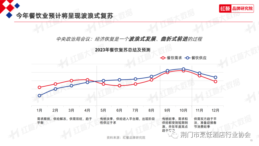 具体表现为,1月—4月为供需双旺的阶段;5月—8月是传统的餐饮淡季,出现阶段性供过于求;9月—12月,受中秋国庆长假影响,预计餐饮需求和供给在短期刺激下将有一定幅度的提升,到达年度高点。