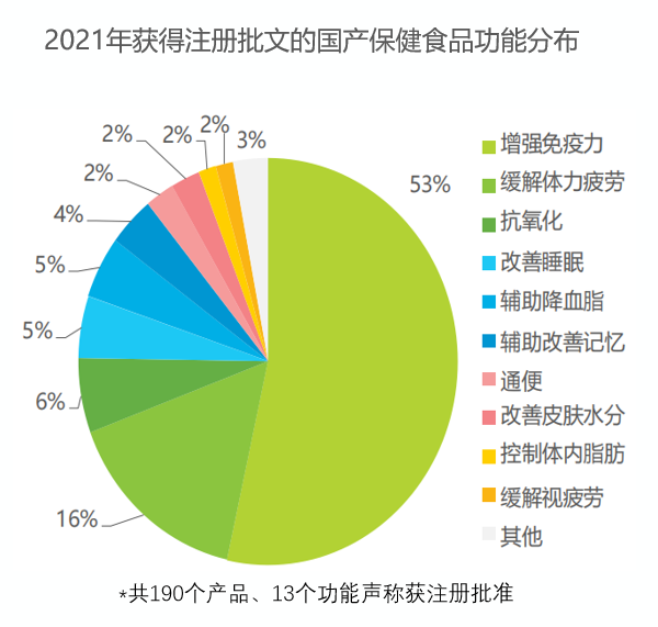 同时,受市场大环境影响,当前保健食品生产企业也更为青睐增强免疫力的相关产品,仅2021年我国获得注册批文的国产保健食品中就有53%的产品功能与免疫力有关。