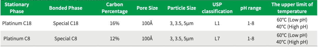 2、MicroPulite® Platinum色谱柱:纯硅胶基质色谱柱的新标准综合性能优秀,可以满足绝大多数反相色谱的应用需求。在低pH条件下,实现优异的峰形和高柱效。