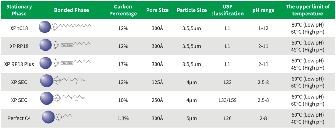 3、MicroPulite® XP色谱柱:杂化硅胶技术让方法开发更灵活选用微纯XP系列分析色谱填料和三键键合技术,行业领先的宽pH稳定性以及分离性能,柱子寿命长。XP系列可以匹配所有仪器平台,对应的填料可用于制备纯化更大的样品,保证方法的延续性,提高工作效率。