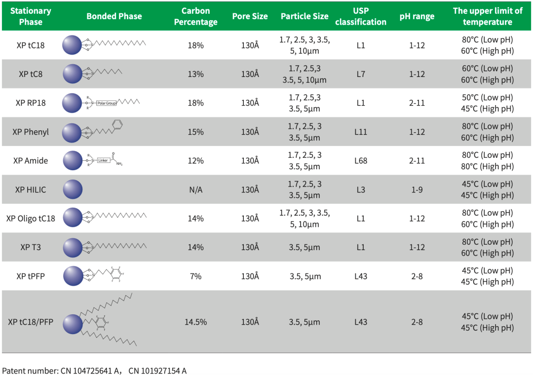 4、MicroPulite® PHS XP系列色谱柱PHS XP色谱柱采用表面带电荷的结构杂化硅胶颗粒,具有杂化硅胶特点,同时在低离子强度的流动相展现 出更优秀的色谱选择性和更好峰形。该系列色谱柱提供从UPLC、UHPLC、HPLC到5μm和10μm等制备填料,从而使方法开发更高效,更有连续性。