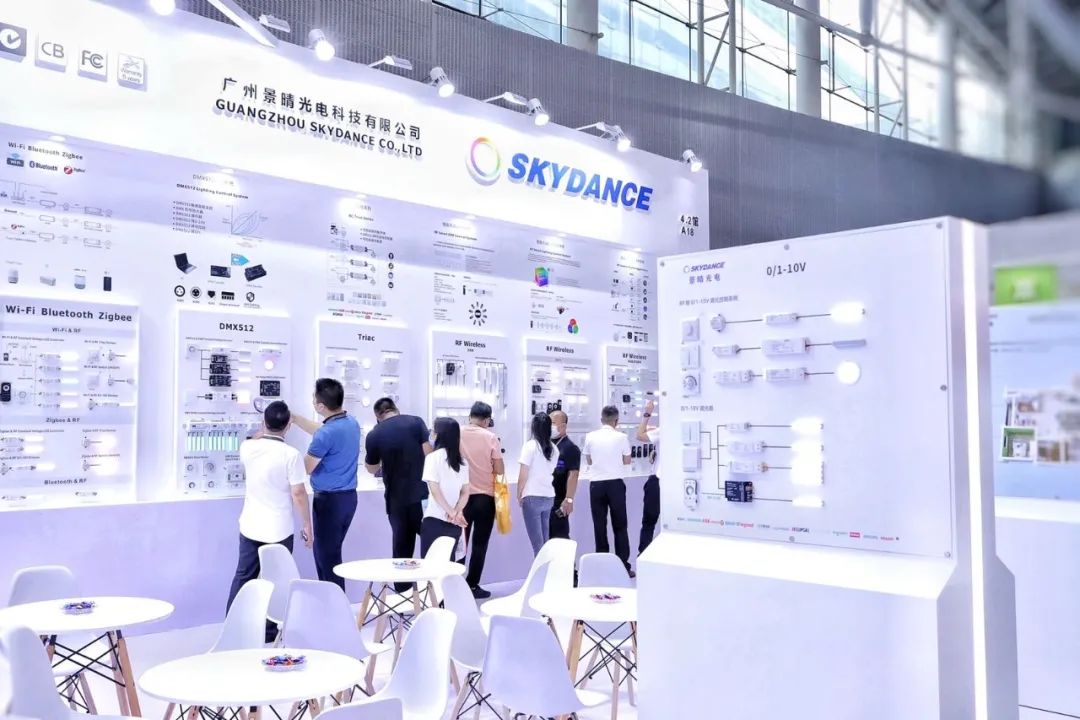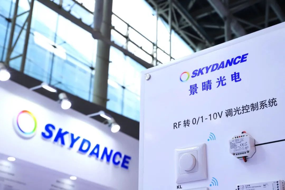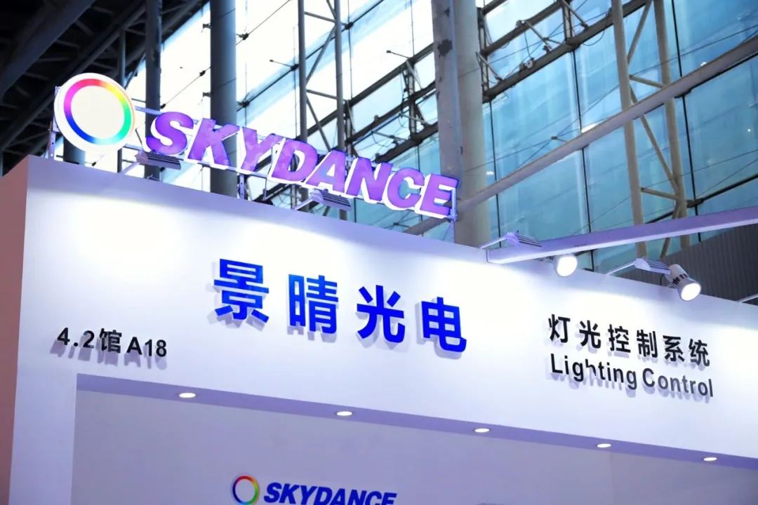 景晴精心打造的展位以白蓝为主色调,简约、典雅,“景晴”和“SKYDANCE”品牌logo融入其中,各系列智能控制产品布局于各空间,直观展示了景晴各系列灯光控制方案,浑然一体,给观众个性化、充满美学的观展体验。