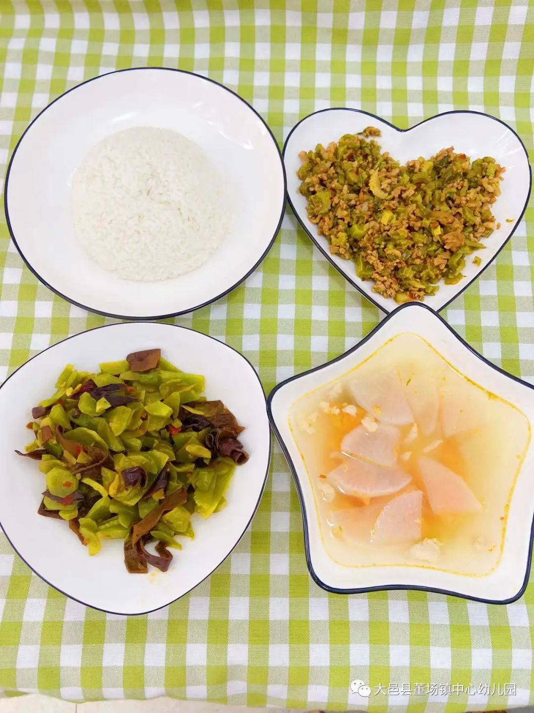珍珠米饭、烂肉芹菜、炝炒青笋片、三鲜萝卜汤