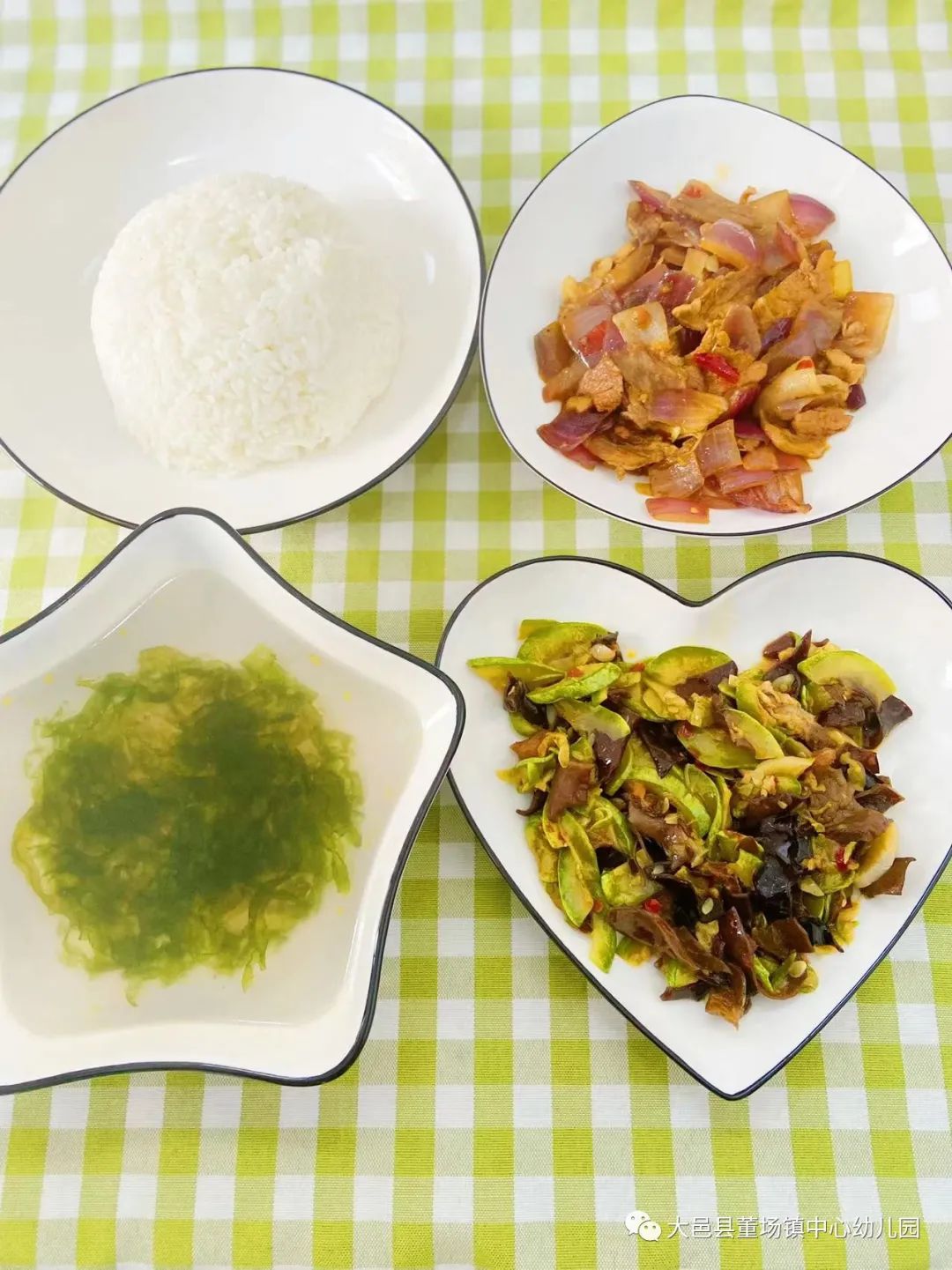 珍珠米饭、洋葱烩肉、炝炒三月瓜、紫菜虾米汤