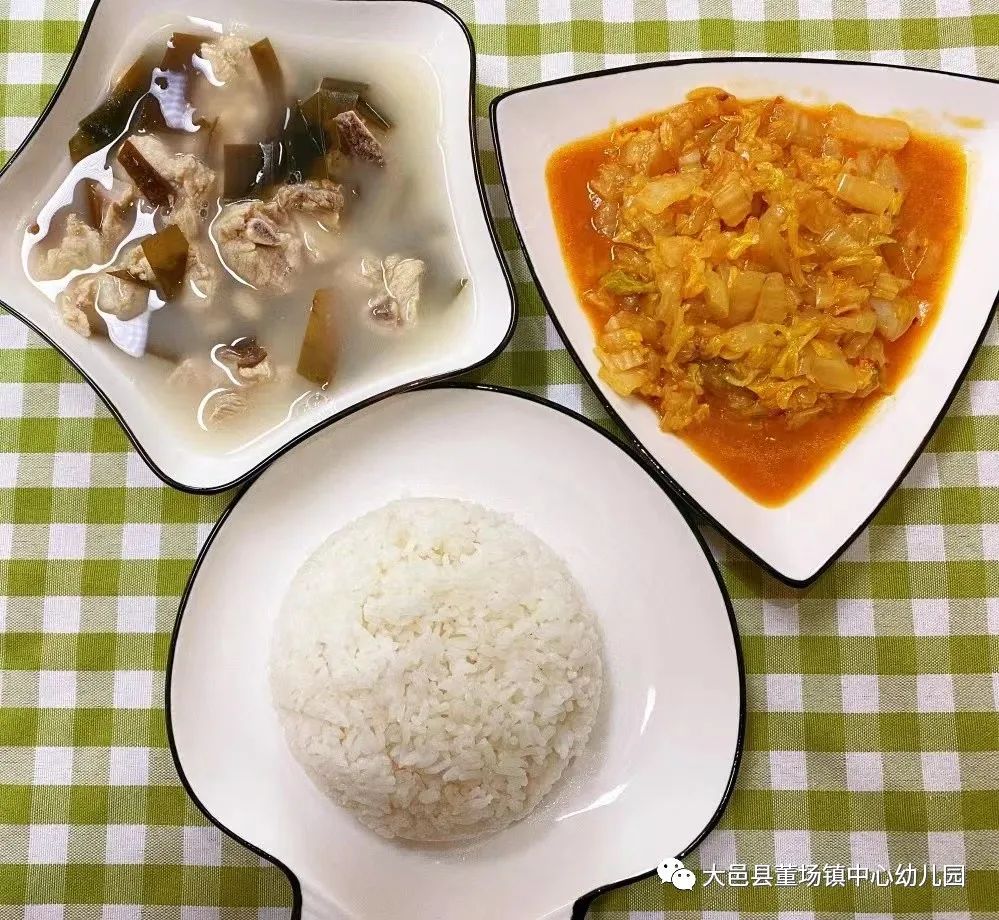 珍珠米饭、绿豆海带炖排骨、醋溜白菜