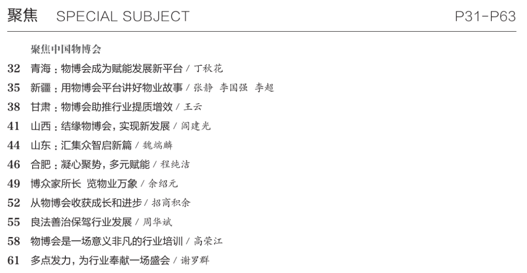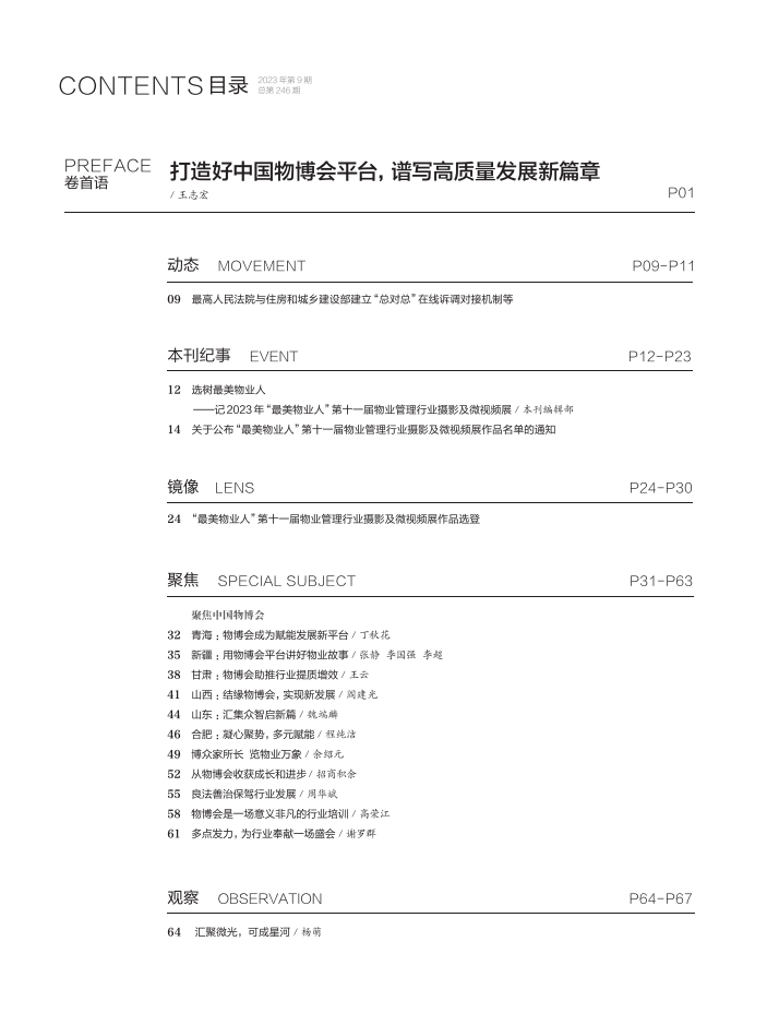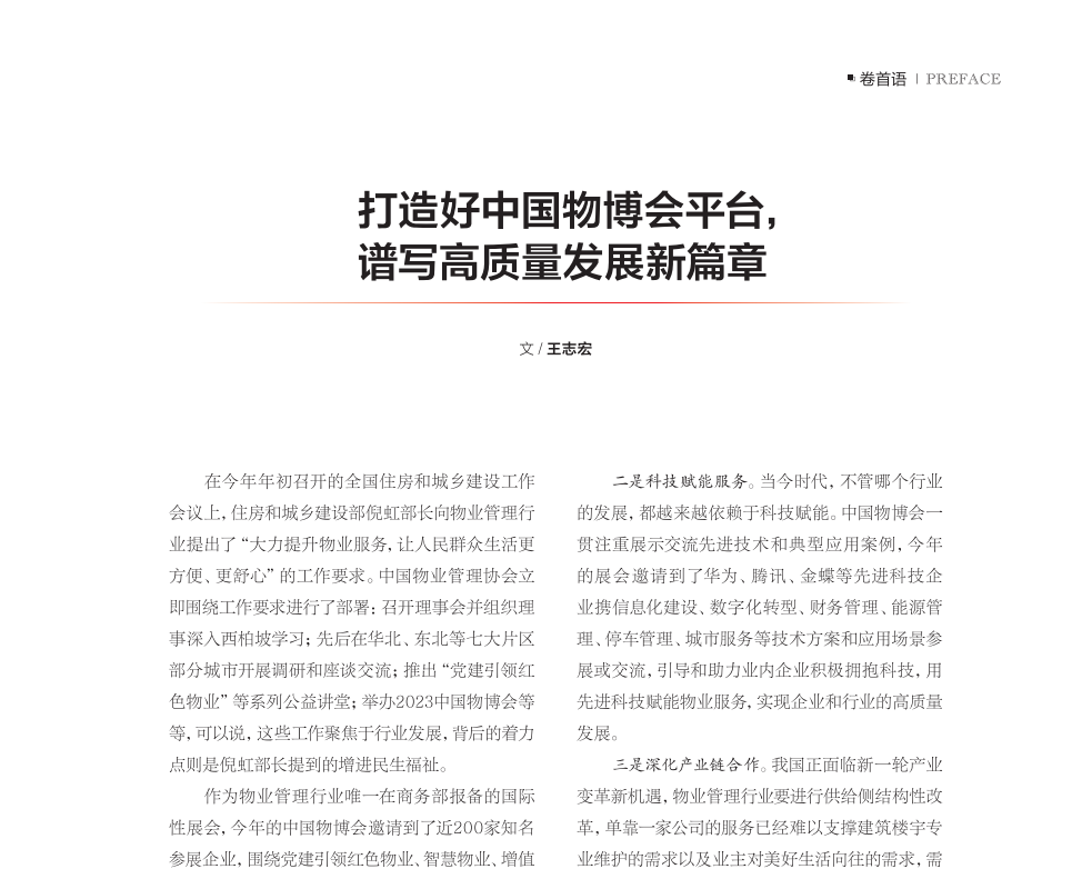 本期卷首语,中国物业管理协会会长王志宏就打造思想高地、科技赋能服务、深化产业链合作三个层面,打造好中国物博会平台,赋能行业高质量发展。