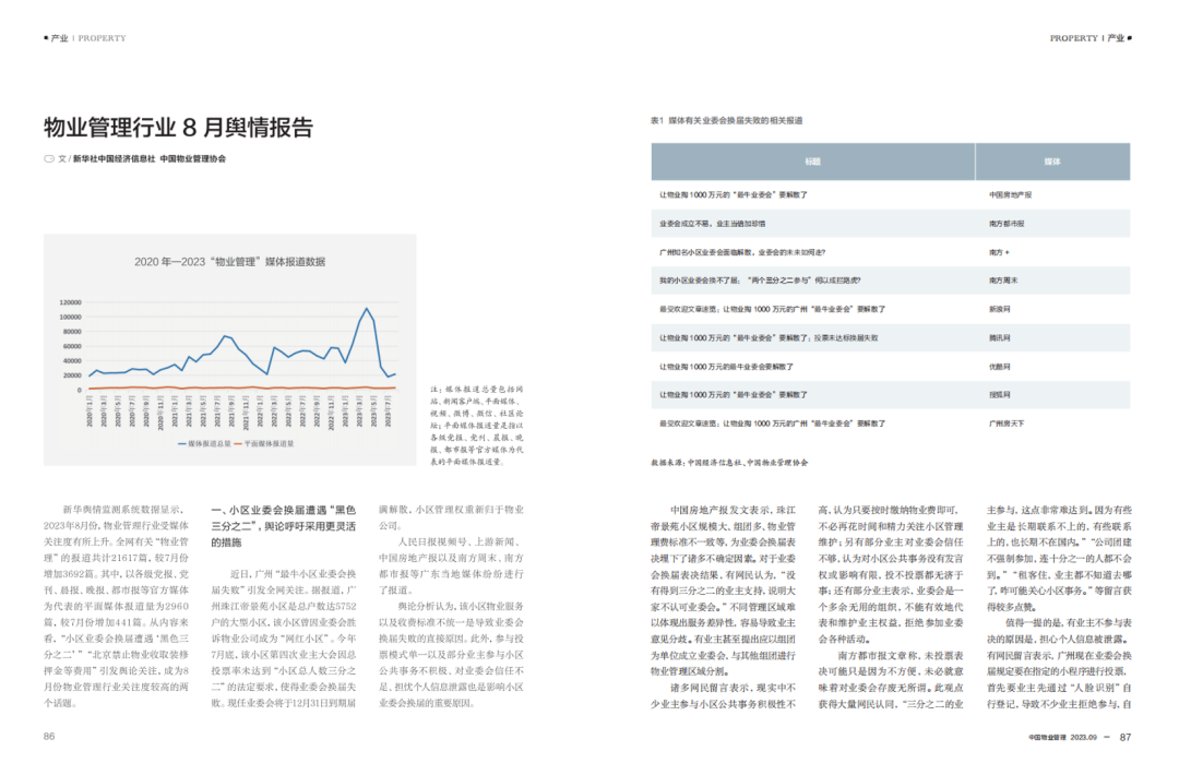 新华舆情监测系统数据显示,8月份,“小区业委会换届遭遇‘黑色三分之二’”“北京禁止物业收取装修押金等费用”引发舆论关注,成为8月份物业管理行业关注度较高的两个话题。