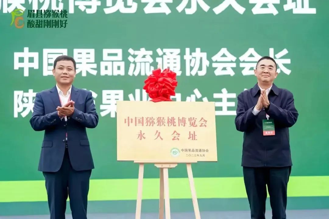 9月22日,在宝鸡市庆祝2023年中国农民丰收节暨猕猴桃产业发展大会开幕式上,中国果品流通协会会长鲁芳校、陕西省果业中心主任赵广柱共同为中国猕猴桃博览会永久性会址揭牌。眉县将猕猴桃产业作为首位产业,紧盯“百年产业、百亿产业”的发展目标,实施猕猴桃“四改五提升”果业革命,全面推进“五化”进程,加速“四链”同构,有力推动了猕猴桃产业质效提升。全县猕猴桃种植面积达30.2万亩、年产量达53.5万吨,先后获评中国特色农产品优势区等二十多项殊荣。眉县猕猴桃品牌价值达161.37亿元,位列全国猕猴桃类区域公用品牌价值榜第一位。眉县猕猴桃产业园区建有猕猴桃科技研发、会展贸易、仓储物流、精深加工等六大功能区,并配套建设酒店、停车场等附属设施,满足了承办中国猕猴桃博览会的需求。从2012年开始,连续12年成功举办了中国(国际)猕猴桃产业发展大会,为猕猴桃产业界开展技术研讨、交流合作、贸易洽谈提供了重要平台。为全方位展示中国猕猴桃产业的发展成就,助力猕猴桃产业转型升级,全面推进乡村振兴,中国果品流通协会将眉县猕猴桃产业园区作为中国猕猴桃博览会永久性会址,并于今年9月22日-9月24日成功举办首届中国猕猴桃博览会。