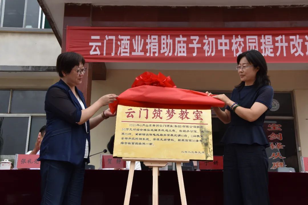 ▲市教育发展研究中心主任于妍同志和云门酒业党委副书记、工会主席张锡静共同为“云门筑梦教室”进行揭牌