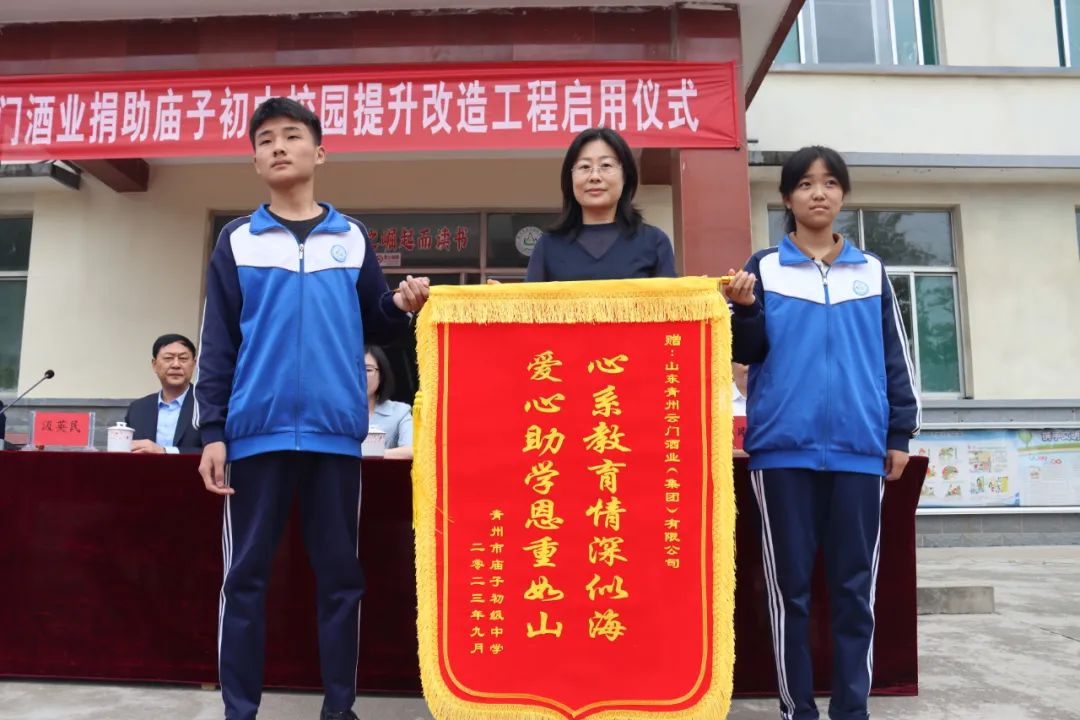 ▲庙子初中的学生代表向云门酒业赠送锦旗