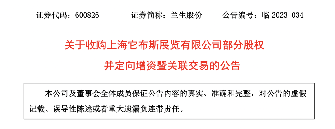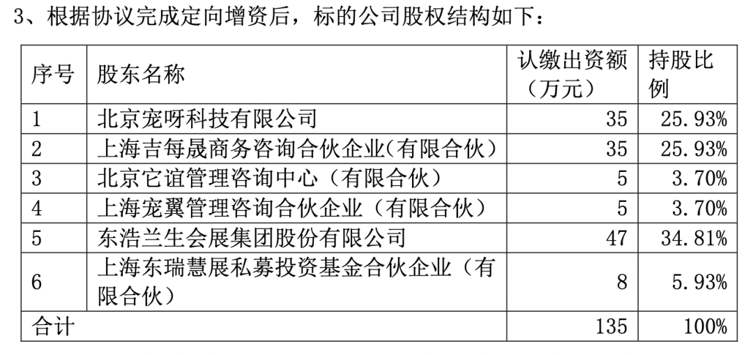 东浩兰生会展集团股份有限公司(以下简称“公司”、“兰生股份”)拟联合关联方慧展基金通过协议受让标的公司股东方北京宠呀科技有限公司(以下称“北京宠呀”)、上海吉每晟商务咨询合伙企业(有限合伙)(以下称“上海吉每晟”)所持有的部分股权,以及兰生股份、慧展基金向标的公司定向增资相结合的方式,合计取得标的公司40.74%股权,其中兰生股份持有34.81%股权、慧展基金持有5.93%股权。