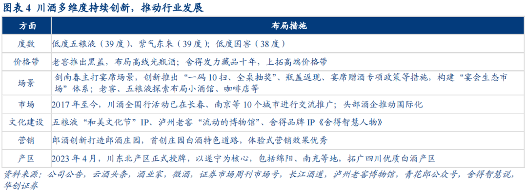 川酒天然具备扩张性与创新性。在产酒量大、酒质优秀、本省强手如林的背景下,川酒天然具备扩张基因和全国化基础,黄金十年五粮液就已引领大浓香率先全国化,目前头部川酒省外收入占比多超7成,在存量时代的今天,川酒亦引领行业在度数、场景、营销等多方面创新开拓,如五泸的低度布局,郎酒的庄园文化等。