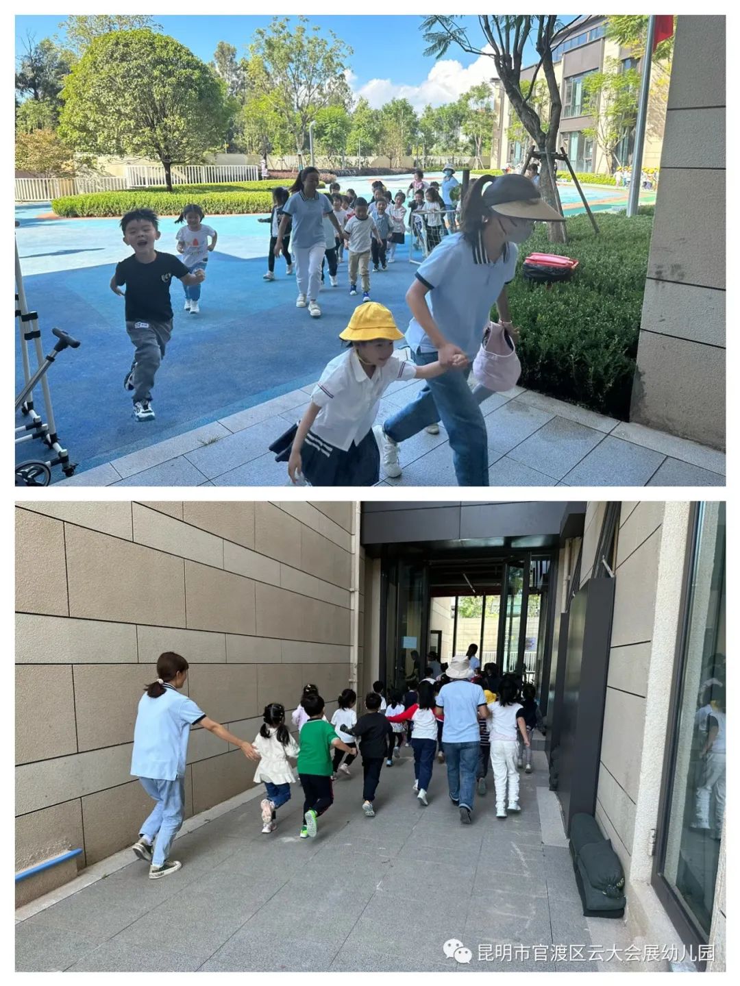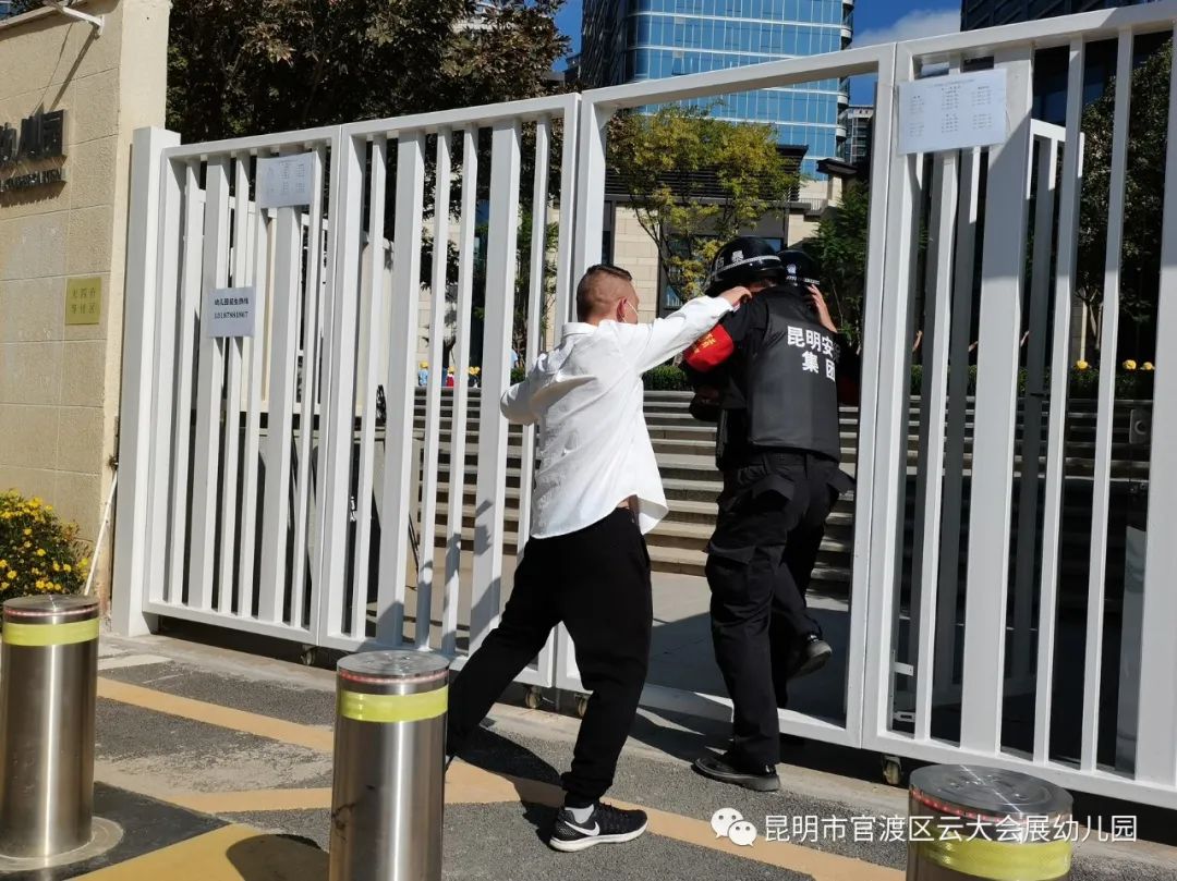 正在户外运动的孩子们,看到“歹徒”强行闯入,听到老师的口令之后,迅速撤离现场,教师在确定所有幼儿转移到安全位置后迅速关紧大门。