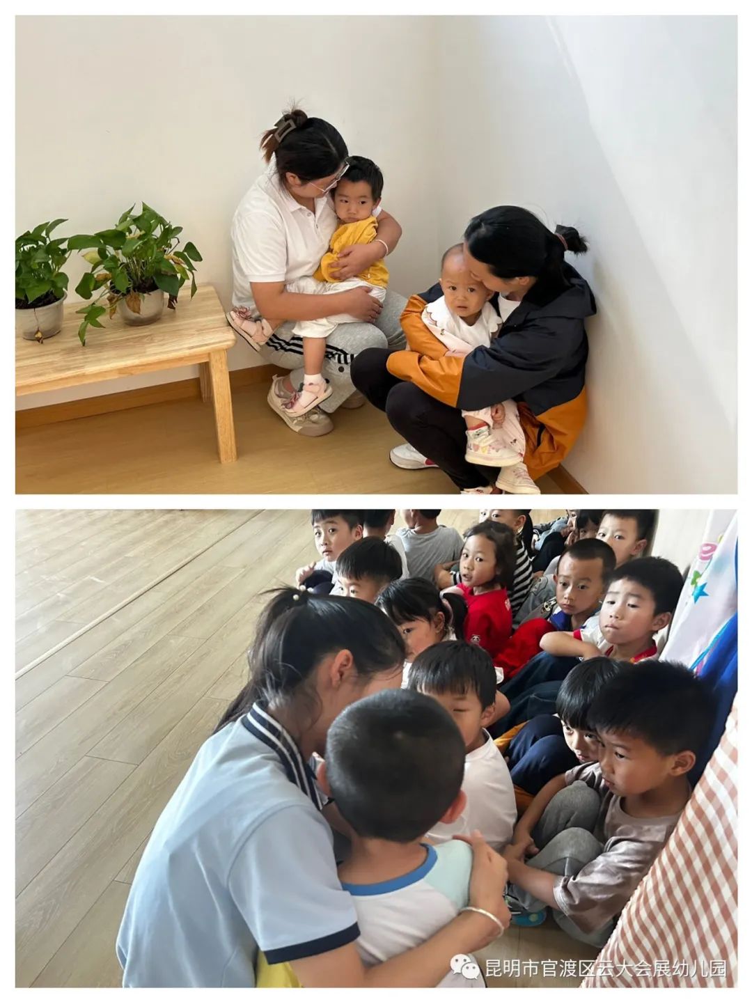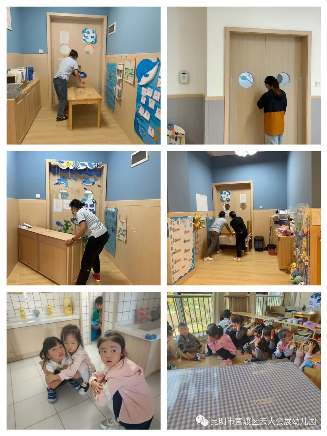 听到警报声,正在开展室内教学活动的教师们迅速组织幼儿躲藏。