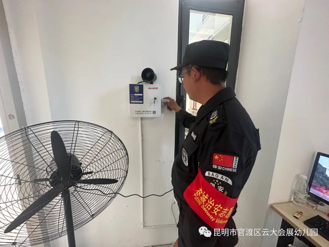 幼儿园安保人员发现“歹徒”入园及时向园领导报告,启动应急预案,并通过一键报警器报警。