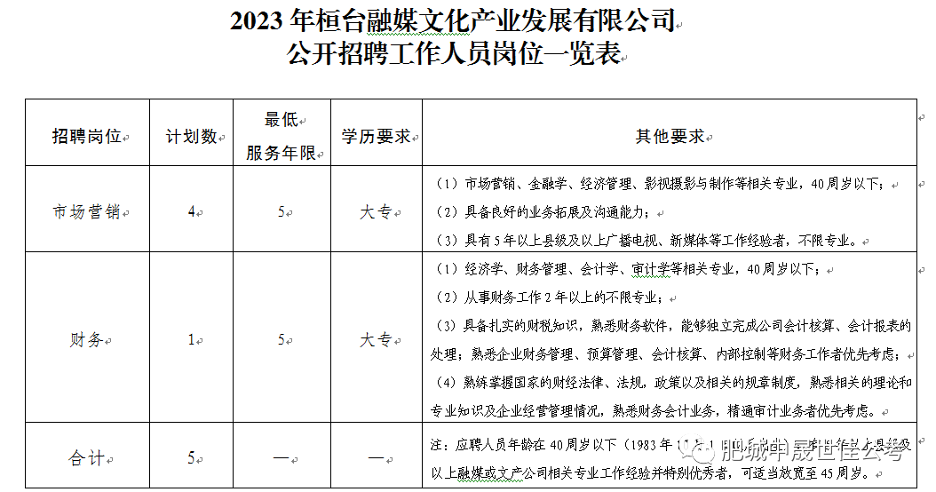 | 桓台融媒文化产业发展有限公司成立于2020年6月23日,是桓台县金川产业投资有限公司下属的国有公司,由县融媒体中心代管并运营。经营范围主要是以文化项目开发运营,广播电视节目制作、发行,影视策划、舞台艺术造型策划、企业营销策划,设计、制作、发布、代理多媒体广告,组织文化艺术交流活动、文艺演出活动,会议服务、展览展示服务、创意服务,文化产品、计算机软硬件研发、销售,美术设计制作、电脑图文设计制作等为主。根据业务发展需要,经研究决定,现决定面向社会公开招聘优秀专业人才5名,其中:市场营销4名,财务人员1名。公告如下:招聘工作坚持“公开招聘、公平竞争、公开选拔、择优录取”的原则,接受上级主管部门和社会公众的监督。本次招聘共2个岗位5人,具体岗位及要求详见《2023年桓台融媒文化产业发展有限公司公开招聘工作人员岗位一览表》(附件1)。  1.具有中华人民共和国国籍,拥护中国共产党的领导,政治立场坚定,遵纪守法;3.品行端正,品德优良,无不良行为记录和违法犯罪记录;5.工作经历年限及其他未明确的时间计算截止日为2023年10月1日;6.具有良好的职业素养、心理素质和饱满的工作热情,具备履行岗位职责所必需的综合素质、专业知识和技能,服从公司分配,遵守公司规章制度;7.在职人员(含已签订就业协议人员,下同)应聘的,须征得所在单位(就业协议单位,下同)同意;4.在读全日制普通高校非应届毕业生不能应聘,也不能用已取得的学历学位作为条件应聘;本次招聘严格按照国有企业公开招聘程序进行,具体招聘程序为:报名时间:自本公告发布之日至2023年9月27日16时止。本次公开招聘采取网上报名、审核的方式进行,请将下列报名材料打包发送至zbzhaopin2023@163.com,邮件标题格式为“应聘岗位+姓名”。请应聘人员如实填写、提交个人信息资料,且保证材料图片真实、有效、完整、清晰。每人限报一个岗位。不按相关要求报名者不予审核通过。1. 《桓台融媒文化产业发展有限公司公开招聘报名登记表》(附件2);2.身份证(正反面合成一张图片)、国家承认的学历学位证书、(国内学历需提供学信网学籍验证报告、国(境)外学历需提供教育部留学服务中心出具的学历学位认证书)、专业技术职称、职业(执业)资格证书等材料;3.工作经历、职位证明材料(任职文件、聘用合同等)以及证明个人经验、能力及业绩的相关材料;资格审查贯穿招聘全过程。学历按应聘人员填报的最高学历认定。所学专业按应聘人员最高学历对应的所学专业认定,辅修双学位的按主修专业认定。网上资格审查通过人员采取电话或短信等方式告知,具体考试时间、地点和相关事宜将通过电话或短信等方式告知,未接到通知者即未进入面试范围。请各位应聘人员保持手机畅通,出现无法联系到本人等情况,视为自动放弃。网上资格审查不作为确定符合应聘条件的最终依据。现场审查与网上资格审查不一致的,以现场资格审查结果为准。面试采取半结构化与结构化面试相结合的方式,根据应聘人员的综合素质、专业水平及岗位匹配度等进行测评,确定是否符合本次招聘岗位的要求。面试采用百分制计算成绩,成绩计算到小数点后两位数,尾数四舍五入,面试成绩设定最低合格分数线70分。面试成绩分岗位由高分到低分确定排名顺序。进入面试范围人员应携带以上报名资料原件和复印件进行现场审核并参加面试。根据面试成绩顺序,按1:1.5的比例确定进入考察、体检范围的人员。1.组织体检。公司统一组织人员进行入职体检。体检标准和项目参照《关于修订〈公务员录用体检通用标准(试行)〉及〈公务员录用体检操作手册(试行)〉有关内容的通知》(人社部发〔2016〕140号)执行,国家另有规定的从其规定。应聘人员未按规定时间、地点参加体检的,视为自动放弃。应聘人员体检不合格或在体检过程中存在弄虚作假、隐瞒影响聘用的疾病、病史等违规行为的,不予聘用或取消聘用。2.组织考察。对应聘人员提供的相关学历、资历证件进行核查,对工作背景进行调查,严格审核档案。如果考察不合格或发现在应聘过程中有弄虚作假等违反招聘有关规定的行为,不予聘用或取消聘用。3.因考察体检不合格、弃权、未按要求提交同意应聘证明或解聘证明材料等原因造成空缺的岗位,可从进入考察、体检范围的人员中,按考试总成绩排名顺序依次等额递补。公司将综合面试、体检、考察情况,研究确定拟录用人员名单,公示7个工作日满,无异议后按规定办理录用手续,签订正式劳动合同。签订聘用合同时按规定执行,应聘人员未在规定的时间内报到的,视为弃权。新聘用人员按规定实行试用期制度,试用期包括在聘用合同期限内。试用期满合格的继续聘用,不合格的解除聘用合同。被录用人员签订正式劳动合同,公司负责缴纳五险一金。确定被录用人员须服从公司统一安排。试用期、工资待遇等按照公司现行制度执行。(一)资格审查贯穿招聘工作全过程。应聘人员应提供真实有效的相关信息和材料,在招聘工作中发现审查通过人员不符合应聘资格或弄虚作假等问题,公司有权随时取消录用资格,解除劳动合同。(二)本次招聘录用人员入职后须服从统一安排,在公司系统内统筹调配,不服从或无法协商一致的,视为放弃应聘岗位。(三)招聘过程中的重大问题由公司经理办公会