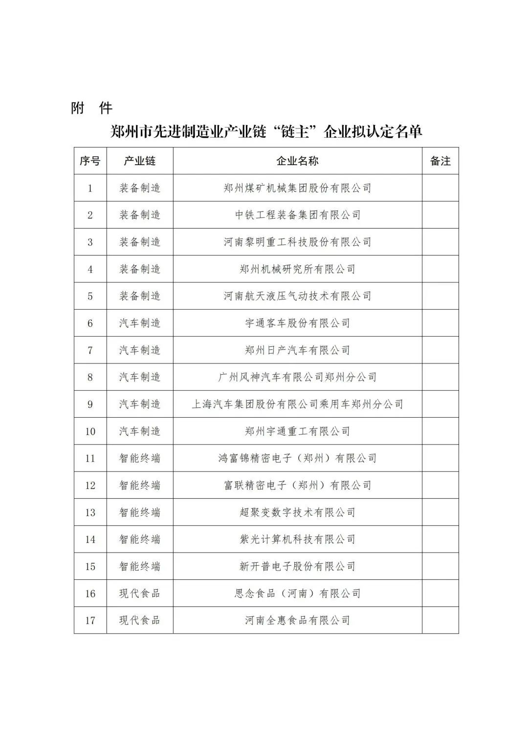 附件:郑州市先进制造业产业链“链主”企业拟认定名单
