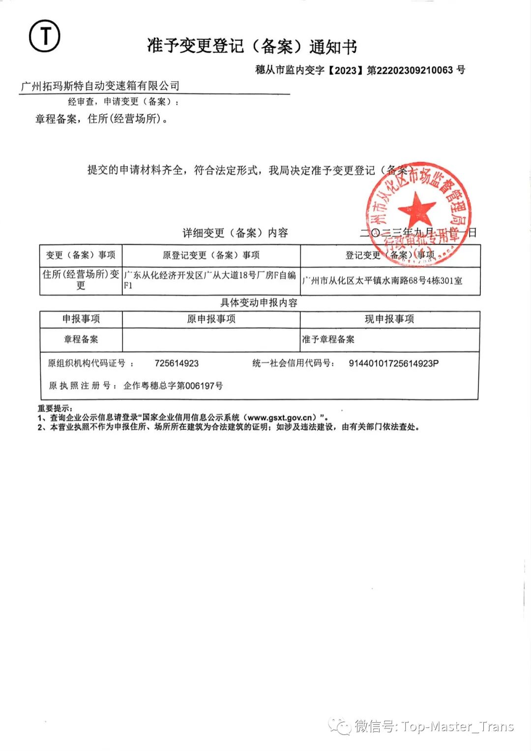 因应业务发展的需要,我司广州总部已于2023年7月起搬迁至从化太平镇廣全高新产业园新址(广州市从化区太平镇水南路68号4栋301室)继续生产和服务。相关工商营业执照地址已更新完毕。搬迁至新址后,公司广州总部生产营业面积从之前的1200余平米增加到2000余平米,并更新了部分生产、检测设备。