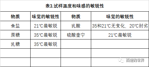 像这样,各种原味,根据不同的试样温度对舌的刺激是不一样的,因此感官检查如果不考虑温度的影响,就不能得出正确判断。