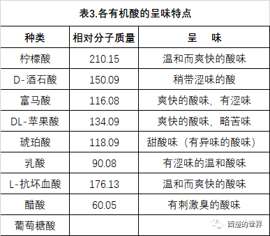 各种有机酸味道各不相同。例如,醋酸是挥发性酸,琥珀酸有鲜味和辣味,其他的酸则很难测出味道的差异。表 3 为各有机酸的呈味特点。
